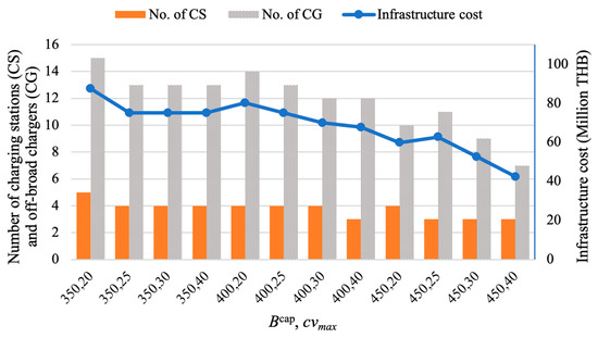 Analysis results of WT on the number of off-board chargers and infrastructure cost (Million THB).