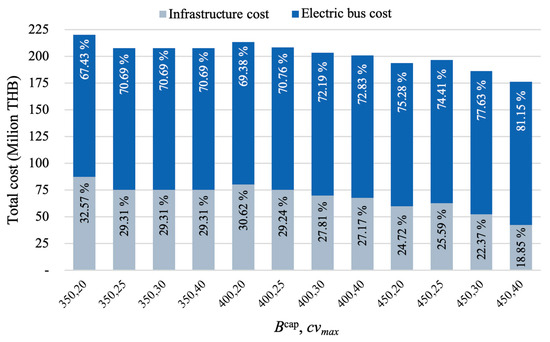 As shown in Table 8 and Figure 7, EB cost consistently accounts for the largest proportion of the total system cost for all scenarios. As increases from 350 kWh to 450 kWh, infrastructure cost decreases significantly, while EB cost rises. For instance, at = 350 kWh and = 20 min, infrastructure cost accounts for 67.43% of the total cost (87.57 million THB), while EB cost represents 32.57%. In contrast, at = 450 kWh and = 40 min, infrastructure cost drops to 18.85% (42.36 million THB), while EB cost rises to 81.15%.