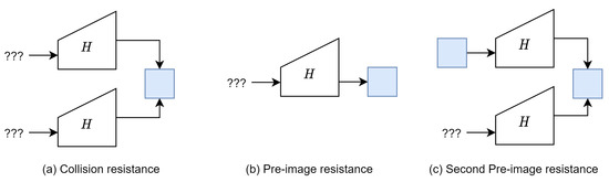 A hash function converts any message of arbitrary size from an entire set of binary sequences to some fixed-length set of binary sequences for mapping data [63]. Hash functions are basically many-to-one and one-way functions. One of the critical features that hash functions must consider is the collisions, which means different messages generate the same hash output. However, collisions in hash functions are inevitable because of the pigeonhole principle. But the collisions should be as difficult as possible. Techniques such as the birthday paradox and Wong’s method [64] have been proposed to determine collision resistance terms, which was officially described by Damgard [65] in 1987. Two other important features are as follows: pre-image resistance is the irreversibility of a hash function and second pre-image resistance is finding a different input message that returns the same hash value as a given message [66]. These resistances are the three basic hash function properties shown in Figure 2.