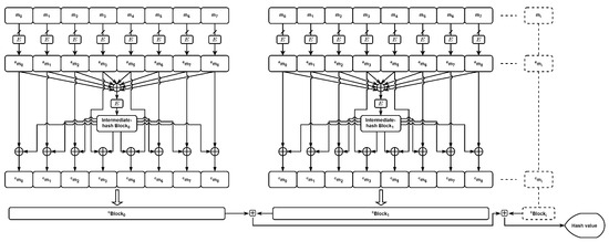 - Yang, Y.; Chen, F.; Zhang, X.; Yu, J.; Zhang, P. Research on the hash function structures and its application. Wirel. Pers. Commun. 2017, 94, 2969–2985. [Google Scholar] [CrossRef]