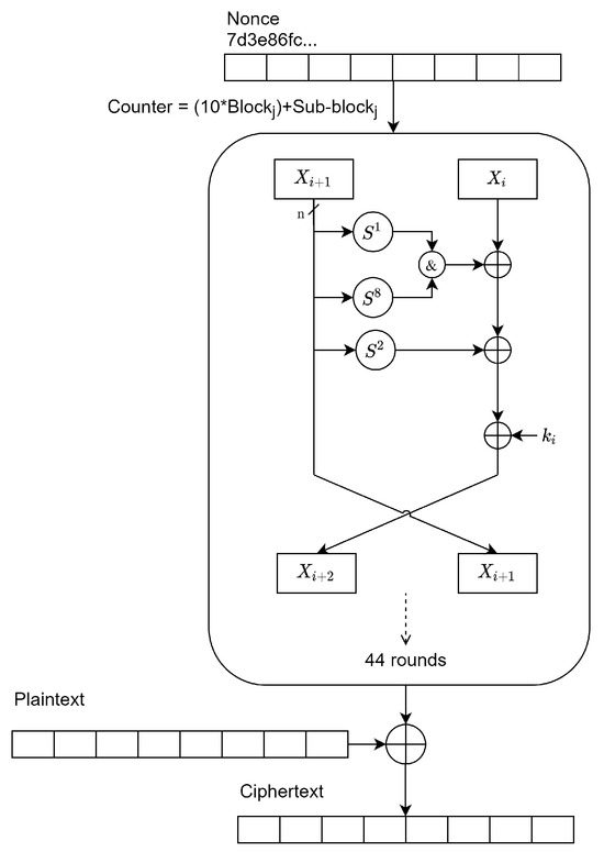 Figure 4 shows the block cipher scheme, which operates in CTR mode. An increment-by-one counter is usually used in CTR mode to produce different values with the same data. However, it is not suitable for parallel processing. The nonce value is calculated by multiplying the block index by ten and adding the sub-block index for parallel processing. The nonce value is ciphered instead of plaintext, and the nonce value is recalculated for the next operation. The ciphered message is XORed with plaintext to create the ciphertext. The round function of the SIMON cipher consists of AND, circular shift and XOR operations, which is the two-stage Feistel map. The message is partitioned into two words of subcipher ( and ), and different processes are applied to the branches and affect each other. The left subcipher is circularly shifted by 1 bit and 8 bits before the AND operation. The result of the AND operation and 2-bit shifted left word of subcipher is XORed with the right word of subcipher. Then, the round keys are XORed with the right branch. The obtained right and left words of subciphers are swapped.