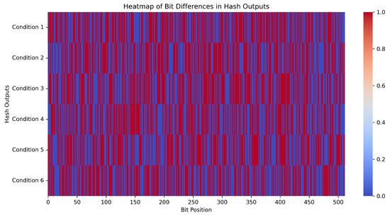 The 512-bit binary representations of the hash values under six different conditions are illustrated as a heatmap in Figure 5. The heatmap clearly shows that the proposed PLWHF exhibits high sensitivity to any modifications in the original text message, with significant bit changes observed across different input variations.