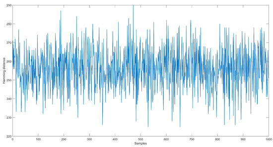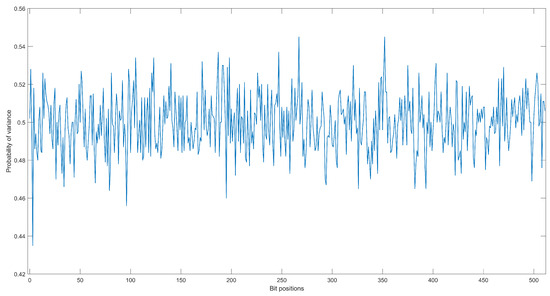 Initially, 1000 random text messages are generated with a pseudorandom number generator known as Mersenne Twister (MT19937) and produce the resultant hash values. Subsequently, a random bit on the original message is changed, and the hash value of the resulting new message is generated. Table 2 shows the variation in the generated hash values, and additional parallel hash functions are attached for benchmarking. The average number of bit changes and the probability of bit change characteristics are achieved by the optimum value of for PLWHF. It is good to have a small standard deviation to hold the bit changes in the intended scale. The proposed PLWHF has a lower standard deviation than other 512-bit similar hash functions and has a good proportional value concerning digest size compared to other hash functions. The average of changed bits and percentage of bit change performance provide the desired values.