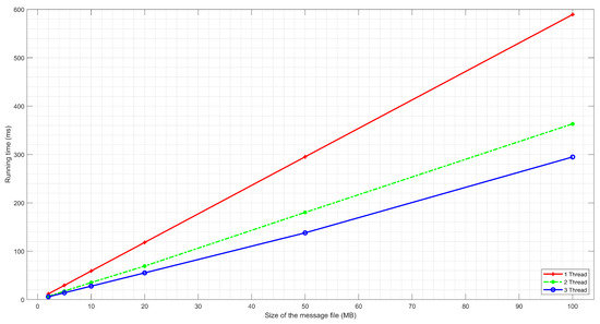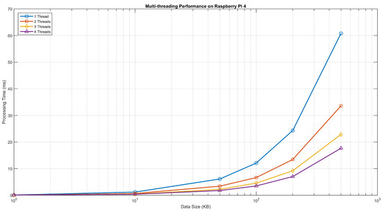 According to Amdahl’s Law, the scalability of the proposed system is inherently limited by its sequential components. While the final addition step is performed sequentially, the primary computational workload—encryption and XOR operations—is efficiently parallelized, providing a significant speedup in multi-threaded execution. Experimental results indicate that using two threads improves performance by approximately 40% for laptop and 50% for Raspberry Pi 4, while the efficiency gain diminishes with additional threads due to the increasing impact of the parallel overhead. This trend continues for four or more threads, where parallelization benefits gradually plateau. The impact of parallelization on system performance is further illustrated and discussed in Section 4.