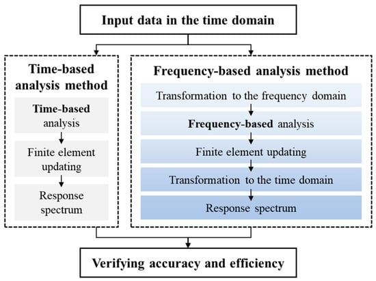 Figure 1 compares the time-based and frequency-based analysis methods. The key distinction lies in the domain of analysis: the time-based method analyzes data at every time step in the time domain, resulting in high computational costs. By contrast, the proposed method utilizes FFT to convert input data into the frequency domain, allowing the analysis to be confined to the relevant frequency range. By excluding high-frequency regions that are not of interest, the frequency-based approach significantly reduces computational time [,]. The frequency-based method involves an additional transformation process, resulting in higher computational complexity compared to the time-based methods. Nevertheless, the computational efficiency of the frequency-based analysis has increased because the computational advantages from frequency range restriction are greater. The accuracy and efficiency of the proposed method are validated by comparing its analysis results to those obtained using the conventional time-based method and experimental data.