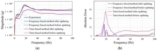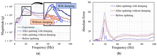 A finite element updating method was applied to improve the accuracy of the analysis results. Damping is a parameter used to obtain a model representing vibration behavior that matches well with the actual behavior. Figure 2 compares the updating results, including and excluding damping with the experimental results, to show the effect of damping on the accuracy of the results. Figure 2 shows the magnitude and the absolute error of the calculated vibration behavior in the frequency domain. As shown in Figure 2a, the peak of the response excluding damping is inaccurate, but the result that includes damping aligns with the experiment. The absolute error decreases through damping, as shown in Figure 2b. Thus, damping should be selected as a parameter along with stiffness and mass when updating.