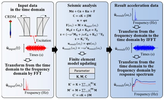 Figure 3 shows the process of the proposed method. It involves using FFT to transform excitation acceleration data for dynamic analysis from the time domain to the frequency domain. A reduction method is applied for efficient dynamic analysis. As the size of the stiffness and mass matrices affect the computation time, the reduction method can improve the computational efficiency. An accurate response is obtained through a frequency-based dynamic analysis using the reduction and updating methods considering damping. To adequately reflect the response of a structure to dynamic loads, the dynamic response is represented by a response spectrum. As the response spectrum takes the time domain data as input, the outputted data are converted into the time domain through inverse FFT before using the response spectrum.