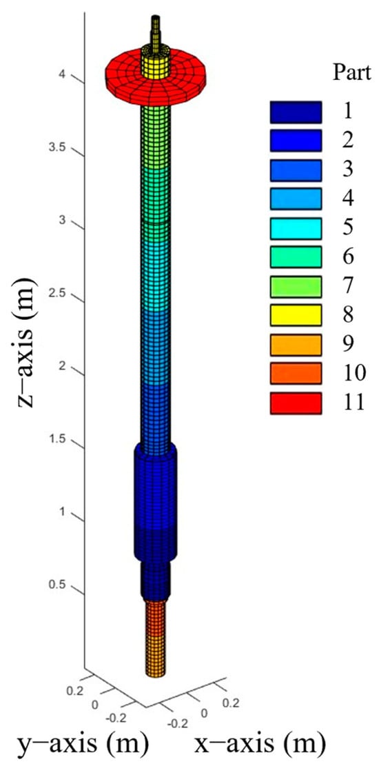The numerical model is CRDM, which is one of the components installed inside a reactor vessel. The power of the reactor can be controlled by modifying the position of the control rod. Figure 4 shows the finite element model of CRDM for dynamic analysis. The CRDM model was divided into 11 parts. The maximum height of the model is 4487 mm. The model is constructed using a three-dimensional eight-node hexahedron. The number of elements, nodes, and total degrees of freedom are 9584, 14,013, and 42,039, respectively.