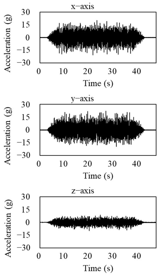 A dynamic experiment using a CRDM prototype was conducted by the Korea Atomic Energy Research Institute [,,]. The experimental data were used for the dynamic analysis. To implement the proposed method, the acceleration data obtained from the experiment were used as input. Figure 5 presents the input acceleration data in the x-, y-, and z-axis directions in the time domain, which were used for both the experiment and analysis.
