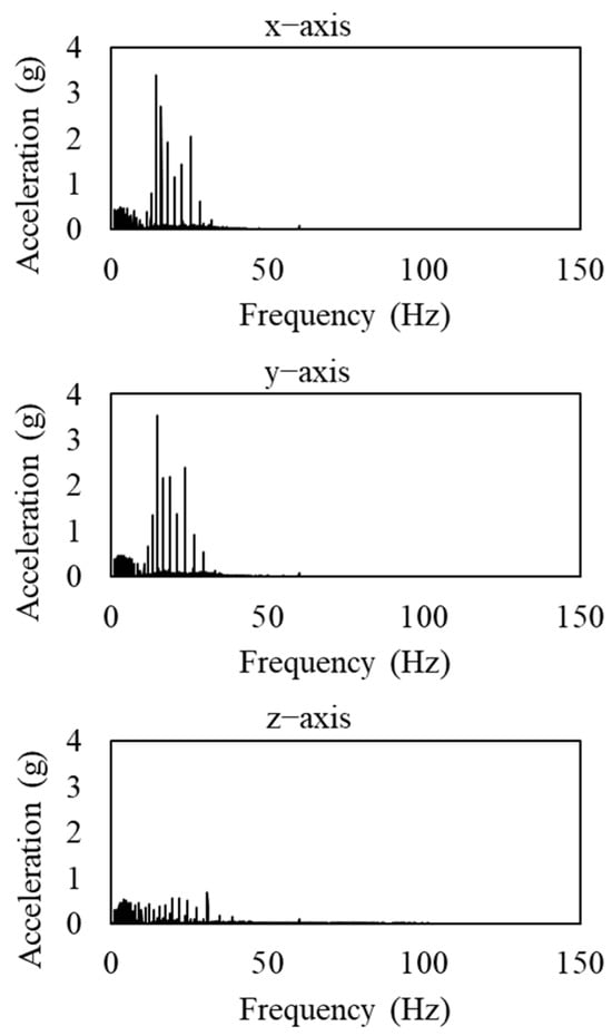 For the frequency-based analysis, the acceleration data in the time domain were transformed into the frequency domain using FFT, which decomposes the input signal into a sum of sinusoidal components across a range of frequencies. The seismic design criteria for nuclear reactors typically consider frequencies up to 50 Hz [,,]. For conservative consideration of the frequency range of interest, the range was set to 150 Hz. However, the transformed acceleration data initially spanned frequencies up to 800 Hz, resulting in excessive computational requirements. By excluding unnecessary frequency components (150–800 Hz), the analysis frequency range was optimized, and computation time was significantly reduced. Figure 6 illustrates the acceleration data for the x-, y-, and z-axis directions transformed into the frequency domain.