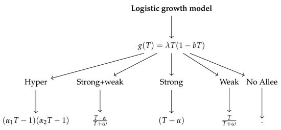 In the analysis presented below, we will discuss different forms of the functions and that will represent the coupling of various growth dynamics and Allee effects. Specifically, we will analyze the linear growth model in Section 3 and the logistic growth model in Section 4. We will pay more attention to the logistic growth dynamics, which may be more realistic than the linear growth in that a carrying capacity for the tumor cells is incorporated. The analytic work will provide a foundation for the comparison in Section 5 concerning bifurcation diagrams and numerical continuation results. Figure 1 summarizes the functional forms of the growth dynamics and Allee effects analyzed in this work, as well as their connections to the bifurcation diagrams in Section 5. Furthermore, we emphasize that the Allee effects discussed throughout this paper will take various types and will be interpreted in a broad sense [].