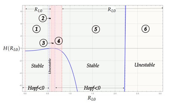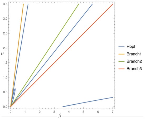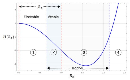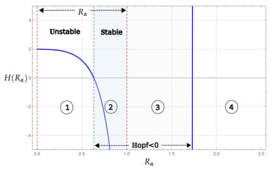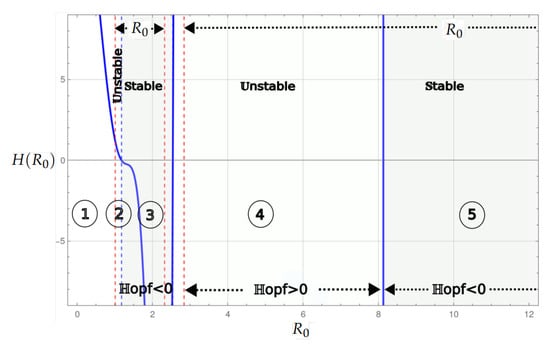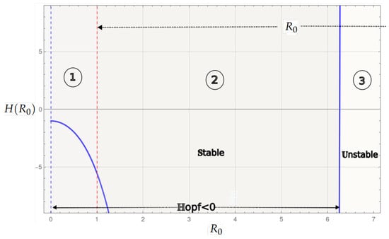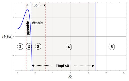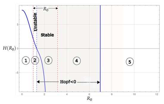 The Hopf bifurcation represents a transition to stability in the system. This bifurcation occurs when we move one key parameter and obtain a pair of complex conjugate eigenvalues, which can be the basic reproductive number . If we take (7), with conditions and , then we obtain one real eigenvalue given by and two conjugate complexes of eigenvalues , with . When is the change in sing, then complex conjugate eigenvalues cross the imaginary axis and appear in the Hopf bifurcation; in this case, the change in sing is given by (22), and if , then we have the symmetric-saddles.