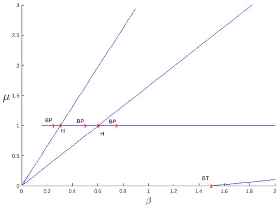 These eigenvalues show a transition in the system’s dynamics, in which the solutions change from unstable to oscillatory behavior; under small perturbations, the system could deviate from the cycle and move towards a different solution or a higher instability. In Section 5, we present the bifurcation diagram corresponding to the Theorem 3, which graphically illustrates some equilibrium phases in the system (17).
