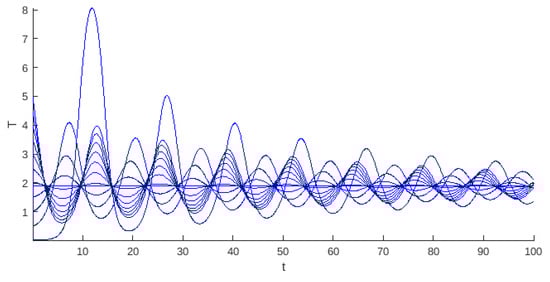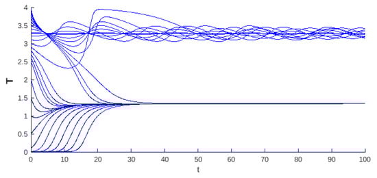 Figure 12, Figure 13, Figure 14 and Figure 15 present the numerical solution of a stable endemic point for different values of weak and strong Allee effects in the logistic growth model. These points were selected using the parameters corresponding to stability in the bifurcation diagram shown in Figure 5, Figure 6 and Figure 7. The numerical continuation confirms the stability of the endemic point under the specific conditions of this region, supporting the analytical results and the bifurcation diagrams previously discussed. This representation highlights how the parametric configurations within this region allow steady-state to be achieved in the dynamical system. On the other hand, Figure 16 shows a case of stability under the Allee hyper effect. Each of these levels of the cancer cell population persists without being completely extinguished. The figure shows that the initial conditions determine the long-term population level. In this case, to reach the high population level, the initial conditions must be in a small neighborhood of the highest stable population level, while for the low population level, the initial conditions can take a larger set of values. The figure shows that an initial condition close to the carrying capacity is governed by the lowest stable level, not the highest level, as expected. Under these parameter values, the basic reproductive number is , corresponding to Region 3 in the bifurcation diagram Figure 7.