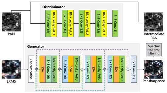 (1) Generator: The generator consists of four SSA modules and five convolutional layers. The convolutional layers use 3 × 3 kernels with a stride of 1. The first two layers use 16 filters each, the next two use 32 filters each, and the final layer uses 11 filters. Leaky ReLU activation and batch normalization (BN) are applied to prevent gradient vanishing. The workflow of the generator is as follows. Firstly, the LRMS and PAN are stacked and fed into the first SSA module, which is used to remove spectral noise and retain spectral information in each image element. Then, the SSA-processed images are fed to the convolutional layer. In the following layers of the generator, deep features are firstly extracted using the convolutional layer, and then SSA processing is performed to refine these features. The output of the final convolutional layer has the same number of channels as the inputs. The output is a pansharpened image that combines the high-resolution spatial information from the PAN image and the spectral information from the LRMS image.