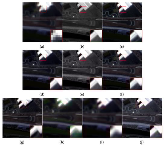 Experimental results of different sharpening methods on the GF-2 dataset. (a) LRMS, (b) PAN, (c) Reference, (d) CNMF, (e) WaveLet, (f) GSA, (g) MTP-GLP, (h) PanNet, (i) FGF-GAN, (j) SSA-GAN.