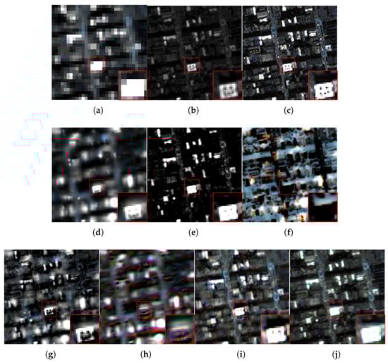 Experimental results of different sharpening methods on the QuickBird dataset. (a) LRMS, (b) PAN, (c) Reference, (d) CNMF, (e) WaveLet, (f) GSA, (g) MTP-GLP, (h) PanNet, (i) FGF-GAN, (j) SSA-GAN.