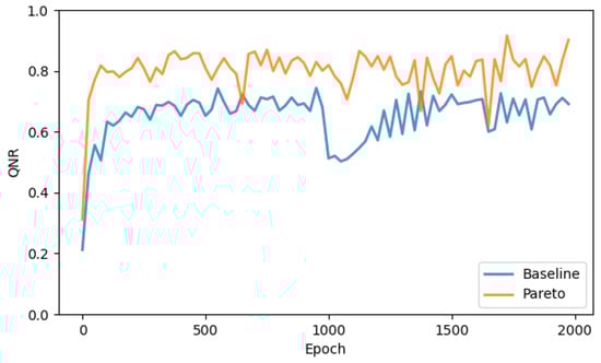 The proposed method of SSA-GAN performs well on pansharpening tasks. The SSA module employs 1DSSA to remove spectral noise and retain spectral information. We visualize the feature outputs from the SSA module by using QuickBird data as the input. The figures can be found in Supplementary Material. The first SSA module output features 5 channels, while the following 3 SSA modules feature 32 channels, indicating a hierarchical feature extraction process. The training process with and without Pareto optimization is illustrated in Figure 4. The baseline (blue curve) rises rapidly at the beginning of the training process, but stabilizes between 0.6 and 0.7 at the later stage, while the Pareto optimization (orange curve) always outperforms the baseline during the training process, and the QNR rises rapidly and stabilizes above 0.8, and finally approaches 0.9, which shows that the Pareto optimization effectively improves the quality of the images. SSA-GAN does not need any training in advance, which mitigates the needs of large-scale training samples. However, SSA-GAN takes long time during inference compared to other methods as shown in Table 4. The extended runtime primarily stems from the iterative optimization and the computation of SSA. SSA-GAN iteratively minimizes the loss function for each image to refine the quality of the pansharped result, similar to ZeRGAN. Additionally, SSA requires the computation of SVD, which is time consuming. This computational overhead is compounded as SSA is applied repeatedly during iterative optimization.