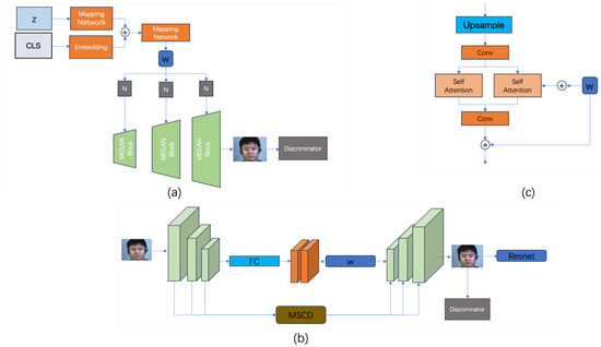 The numerous applications of U-Net in image restoration tasks demonstrate its effectiveness in preserving image details. Therefore, this study initially adopts the U-Net architecture to reconstruct the micro-expression space. Drawing inspiration from advanced StyleGAN and ConditionGAN, a micro-expression generation model combining latent encoding (z) with specified categories is constructed first, projecting them into a less entangled space (). This allows the proposed model to model arbitrary micro-expression feature spaces. Unlike traditional conditional GAN, this study encodes micro-expression information into the latent space in advance to enable subsequent generation networks to perceive category information and transfer it to other tasks, as illustrated in Figure 1a. Subsequently, the intermediate features characterizing the generation process are broadcasted to each MEGAN block. Meanwhile, the feature mapper of the proposed MEGAN blocks aggregates the generated features with reserved feature map regions, thereby allowing features of the generation task to propagate through skip connections.