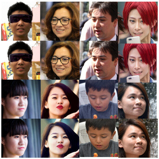 - Bulat, A.; Tzimiropoulos, G. Super-fan: Integrated facial landmark localization and super-resolution of real-world low resolution faces in arbitrary poses with gans. In Proceedings of the IEEE Conference on Computer Vision and Pattern Recognition, Salt Lake City, UT, USA, 18–22 June 2018; pp. 109–117. [Google Scholar]