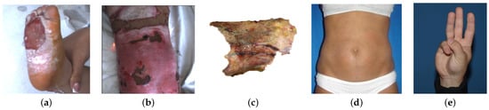 Image examples from the used databases: (a,b) Pediatric burns from BAMSI database, (c) Kaggle burns, and (d,e) healthy skin images (Abdominal Skin Dataset and, respectively, hand gesture recognition).