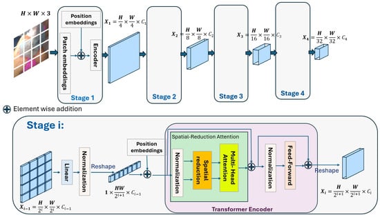 The Pyramid Vision Transformer (PVT) [32], which is used as encoder. The model contains four stages, each made from a patch projection layer and an encoder transformer.