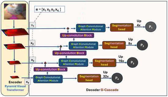 The code is in Python, version 3.10.12 and was developed using PyTorch, version 2.3.10, available at https://pytorch.org/, supported by PyTorch Foundation. for deep learning. All models were trained on a single NVIDIA RTX A4000 GPU (NVIDIA, Santa Clara, CA, USA) with 16 GB of memory. The Adam optimizer was used for training, with a learning rate of 0.0001 and a cosine scheduler. For the third stage, it was reduced by a factor of 10 at half of the epochs. The batch size was set to 1 image for stages 1 and 3 and to 8 images for stage 2. All backbone models were pre-trained on ImageNet. The G-Cascade model comprises 1.78 million parameters and requires 0.342 FLOPs.