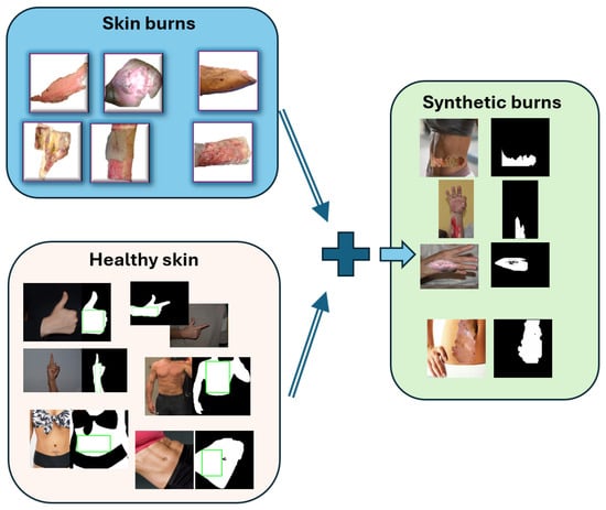 The second strategy refers to creating synthetic images that contain burn patches surrounded by healthy skin areas. This was achieved by combining a public set that contains only burned skin areas (no person, no background) and two databases with healthy skin. While overall, this synthetic database is larger than our real burn images database, the variability here is also limited. The healthy skin is limited to hand images or abdomen areas. At the same time, in many real burn cases, other parts of the body, such as the legs or the face, are wounded.