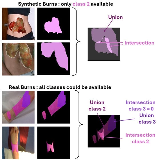 Computation of the adaptive Dice Coefficient, used as a weighting factor when computing the Ambiance preservation loss. The background label (marked with black) is not taken into account. Only the burn classes are considered. The Dice Coefficient uses the ratio between intersection over union for each class. These are marked for two examples: in the upper part, there is a pair of synthetic burns, which are considered to have the burn grade IIA (class 2). In the lower part, there is an example with real burn images, which may contain all classes. In this example, both contain class 2, and thus, the term for class 2 is non-zero, while only one contains class 3 (grade IIB), and thus, the intersection is null.