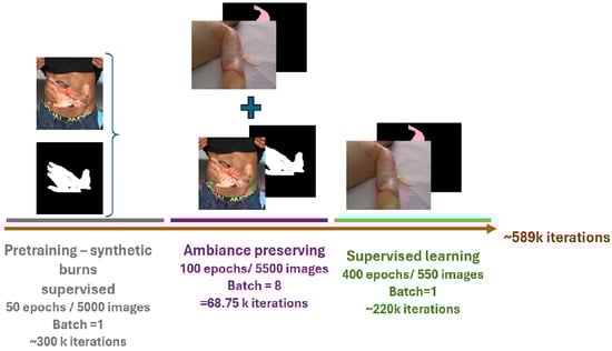 Unlike the PSSCL approach, our method takes a different route by starting with a large set of synthetic images. These images are not perfect representations of real burns, but they provide a diverse and plentiful dataset that helps the model learn general patterns and features. By using these synthetic data early on, we expose the model to a wider range of burn types, lighting conditions, and backgrounds than we would with a limited real-world dataset. An advantage of using synthetic images is that they allow one to pre-train the model in a supervised manner, even in the absence of extensive real-world labeled data. Even if the synthetic dataset is not entirely accurate, it serves as a useful starting point for feature extraction and segmentation learning. In the final phase of training, we fine-tune the model using a smaller set of high-quality, well-annotated real burn images. This step allows the model to correct biases introduced by the synthetic data and adapt to the complexities of real-world cases. The fine-tuning process ensures that the model aligns better with real medical imaging conditions, improving its ability to generalize. Since the additional synthetic data are different from the real-life cases, the technique used falls into the broad category of domain adaptation techniques.