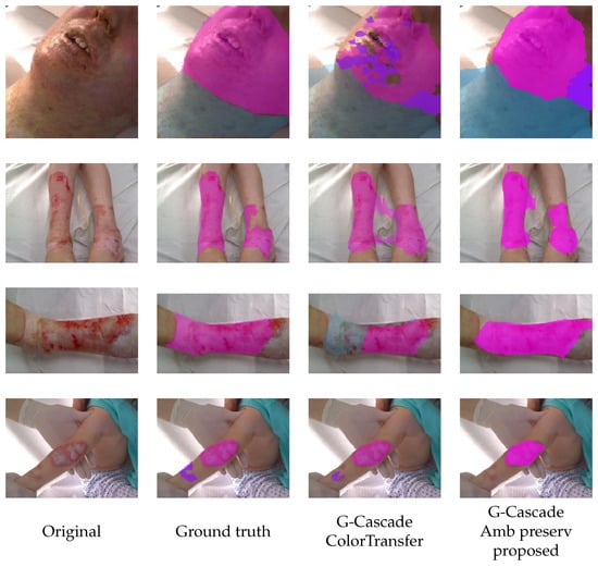 Example of images with pediatric skin burns (original images—first column), ground truth (second column) and predictions with the solution from [23] (third column) and the proposed solution (forth row). Annotations and predictions showing in this example are color-coded by pink (grade IIA), magenta (grade III), and cyan (grade IV).
