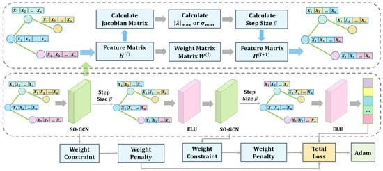 Based on the preceding theoretical results, we propose a stability propagation rule that integrates dynamic step-size adjustment, weight matrix norm constraints, and an upper-bound penalty term. By discretizing the propagation equation, we develop a Stability-Optimized Graph Convolutional Network (SO-GCN) with enhanced training stability, improved prediction accuracy, and superior loss convergence.The of SO-GCN with two layers is shown as Figure 1. During training, the network dynamically determines the weight matrix norm threshold to constrain parameter updates and optimizes parameter space distribution through a differentiable penalty term. Simultaneously, based on the spectral properties of the Jacobian matrix, we employ the forward Euler discretization method to dynamically adjust the step size and introduce a self-loop influence factor to enhance propagation stability.