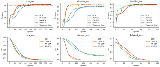 Figure 3 further reveals the dynamic properties of the four models’ training: SO-GCN’s loss curve fluctuates significantly less than GCN’s, confirming the improvement in training stability due to the Dynamic Step-size Adjustment Mechanism. On PubMed’s sparse graph, PW-GCN converges the fastest, but its overall performance is best, with faster convergence, lower training loss (on average), and smoother accuracy curves.