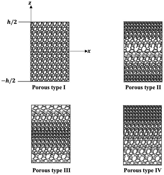 For the main objective of this work, four types of internal pores distributed throughout the thickness of the plate are implemented; one of them is uniformly distributed and the others are non-uniformly distributed, as shown in Figure 2. The closed-cell cellular solids [49,50] provide the mechanical and piezoelectric properties of the porous plate, such as Young’s modulus , Poisson’s ratio , thermal expansion coefficient , the moisture expansion coefficient , the dielectric coefficients , and the piezoelectric coefficients , as follows: