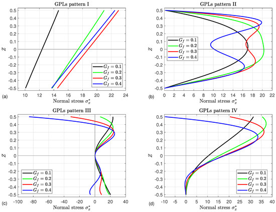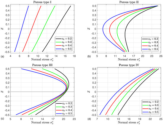 Dimensionless in-plane normal stress through the thickness of GPL pattern I of FG porous nanocomposite piezoelectric square plates for various values of the porosity factor and for the different four porosity distribution types: (a) type I, (b) type II, (c) type III, and (d) type IV.