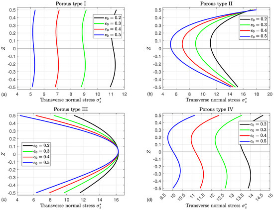 Dimensionless transverse normal stress through the thickness of GPL pattern I of FG porous nanocomposite piezoelectric square plates for various values of the porosity factor and for the different four porosity distribution types: (a) type I, (b) type II, (c) type III, and (d) type IV.