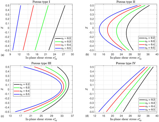 Dimensionless in-plane shear stress through the thickness of GPL pattern I of FG porous nanocomposite piezoelectric square plates for various values of the porosity factor and for the different four porosity distribution types: (a) type I, (b) type II, (c) type III, and (d) type IV.