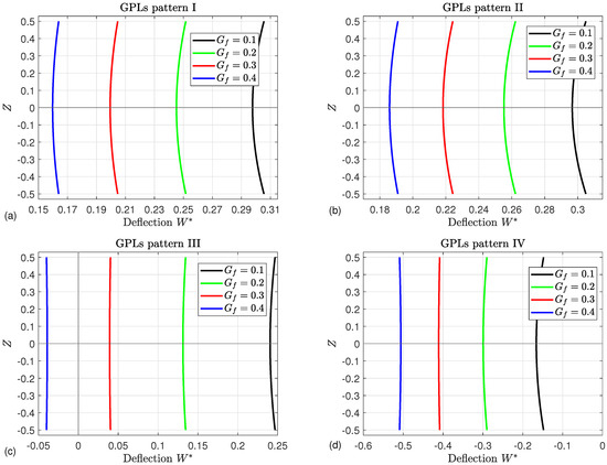 | Mid-plane displacement along -axis | The GPLs weight fraction | ||