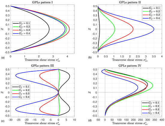 Dimensionless transverse shear stress through the thickness of GPL pattern I of FG porous nanocomposite piezoelectric square plates for various values of the porosity factor and for the different four porosity distribution types: (a) type I, (b) type II, (c) type III, and (d) type IV.