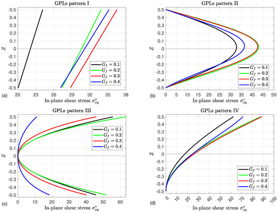 Furthermore, a total of four distinct GPL distribution patterns were developed by modifying the volume fraction of the GPLs across the thickness of the plate and by employing a trigonometric technique. For GPL pattern I, the GPLs are steadily dissipated throughout the thickness, while the GPLs for patterns II, III, and IV are FG through the thickness, as shown in Figure 3. Consequently, the volume fraction of the GPLs is given by the following [50]: