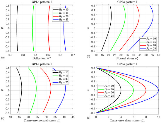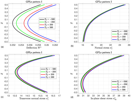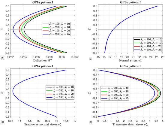 Following the validation of the current theory and formulations, Figure 4, Figure 5, Figure 6, Figure 7, Figure 8, Figure 9, Figure 10, Figure 11, Figure 12, Figure 13, Figure 14, Figure 15, Figure 16 and Figure 17 give many parametric findings for the FG porous GPL piezoelectric-reinforced plates utilizing the Q3DT.