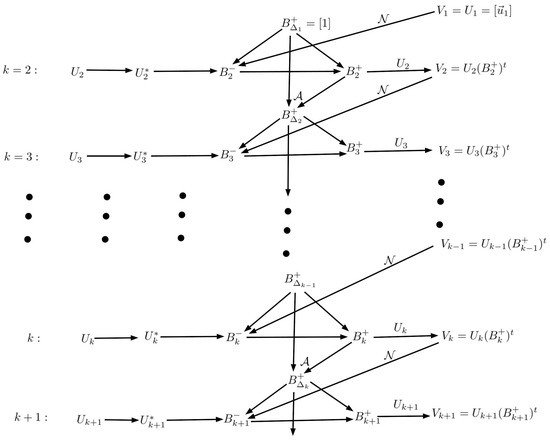 where stands for the formal determinant and is defined by the normalized , where by matrix and is the determinant of . For example, suppose ; ; . Then, the normalized is ; the normalized is ; and the normalized is the normalization of the formal determinant , i.e., the normalized is . This computation, however, has exponential complexity. In order to reduce such complexity and to enhance the comprehension, we kept track of all the indexes of the typical GPS and found out the pattern for an inductive computation. Our approach, i.e., the NsrGSP (non-self-referential Gram–Schmidt process), shows (see Theorem 1 and 3 for more details) the following: , where ; ; and where and .