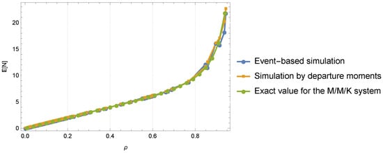 - The final part in the validation process of the simulation models is the comparison of the two algorithms, discrete-event and by the departure moments, with the exact values obtained for the queueing system. Figure 3 shows the results of calculations of the average number of customers in the system depending on the load factor using simulation models and explicit formulaAs we can see, the graphs are indistinguishable up to a certain value of , and, only at high load, small deviations are observed due to the large variance of the obtained estimates. When simulating queues in heavy traffic, estimators of mean characteristics converge slowly to their true values. This problem is exacerbated when the distributions of interarrival and service times have heavy tails.