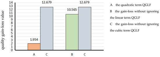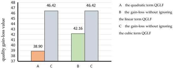 As can be seen from the above example, the value of the gain–loss without ignoring the cubic term quality gain–loss was 3.25 RMB/m3 more than the gain–loss value of the quadratic term QGLF; the value of the gain–loss without ignoring the cubic term QGLF was 4.27 RMB/m3 more than the value of the gain–loss without ignoring the linear term QGLF. The percentage discrepancy value between the estimated and actual losses was 9.19% (see Figure 7).