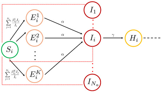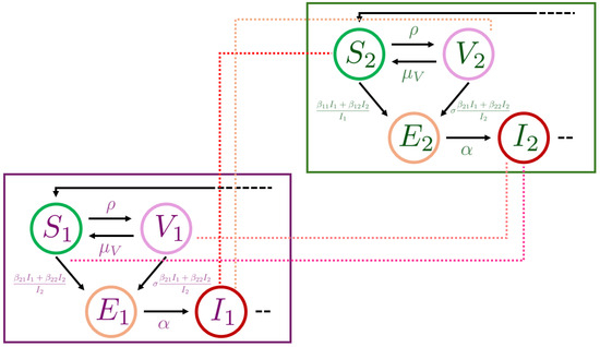 The interactions among the compartments of the various age groups ([38]) in the different exposure contexts are sketched in Figure 2. For the sake of simplicity, we limited ourselves to two age groups, named group 1 and group 2, and only one exposure context for each age group. The corresponding compartments are denoted with , , , , , , and , with . The disease spreads when an individual from is in contact with either an infectious individual from the same age group, , or an individual from . Therefore, the transmission rate of the virus is replaced by the expression , which takes into account both possible contacts. The same holds for an individual in with the appropriate modifications.