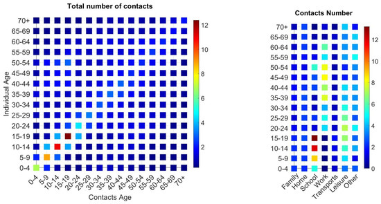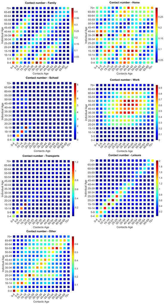To estimate the transmissibility rate for different age groups in different exposure contexts, we used the tables of contacts, based on those proposed by the POLYMOD study [29]. The social contact matrices reported in [29] for different countries estimate the average number of contacts that individuals from an age group have in the following contexts: home, school, work, transport, leisure, and other. In particular, we used the table referring to the Italian case that was also considered by the Italian Scientific Technical Committee (CTS) in the early phase of the COVID-19 epidemic (see [39]). The CTS was established in Italy in February 2020 to provide advice and support for coordination activities to overcome the epidemiological emergency due to the spread of the coronavirus; see also [40]. More recent contact matrices were not used because our study was designed to align with the official data and methodologies adopted by Italian authorities during the 2020–2021 period. We believe that alternative contact tables could have introduced inconsistencies with these reference studies, potentially compromising the comparability and interpretability of our findings within the framework of Italian public health analyses.