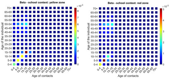 In Figure 6, we can see the of the school context associated with two different scenarios: the yellow zone and the red zone. In the yellow zone, the restrictions included schools totally open up to the third year of middle school and high schools open to , while in the red zone we have schools open up to the first year of middle school, while the second and third years of middle school, high schools, and universities were totally closed.