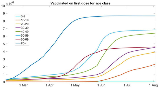 and . In this way, we are able to exploit the SEIHRDV multi-age and multi-group for reproducing the curve of vaccinated people evolving over time for each age group. In Figure 7, we report this evolution in the eight DPC age classes, finding agreement with the actual administrations per age.