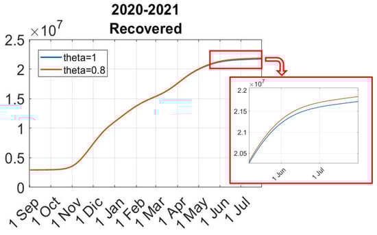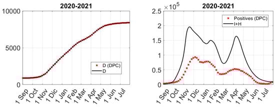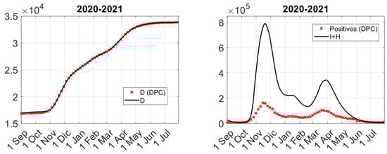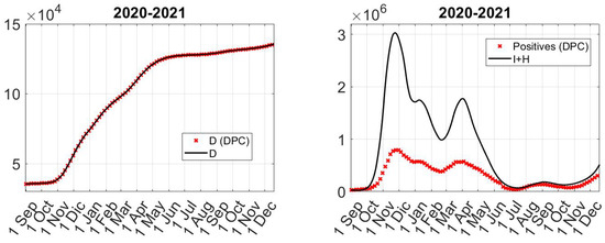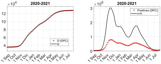In our model, the parameters , , , , , , and are kept fixed in time, while , , and are instead functions of time. The values of these parameters have been deduced from established studies [26] or directly from available data. Following the methodology in [10], we estimate the initialization of compartments that are not directly accessible from the data provided by the Dipartimento di Protezione Civile Italiana https://github.com/pcm-dpc/COVID-19 (accessed on 1 March 2021), such as the Exposed and Infected individuals. This estimation is obtained thanks to algebraic relationships among measurable quantities, including the CFR (Case Fatality Rate), IFR (Infection Fatality Rate) [36], and the recorded number of deceased individuals. The number of delivered doses in (1) is rescaled by the factor to take into account that a portion of doses are administered to both detected and undetected recovered individuals.