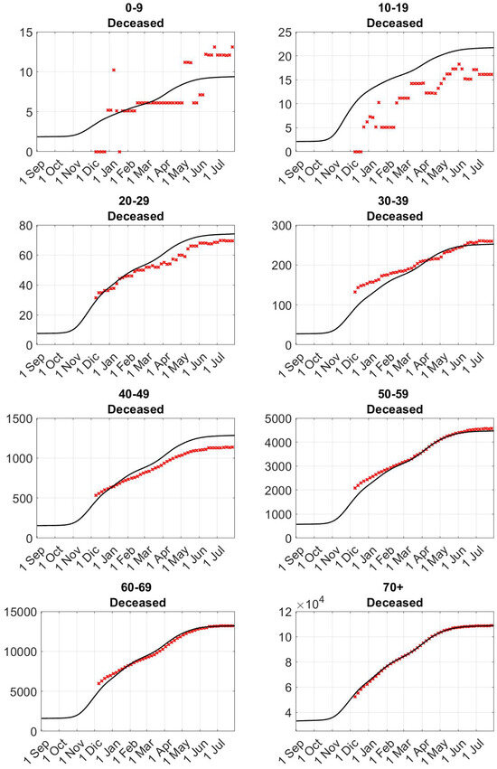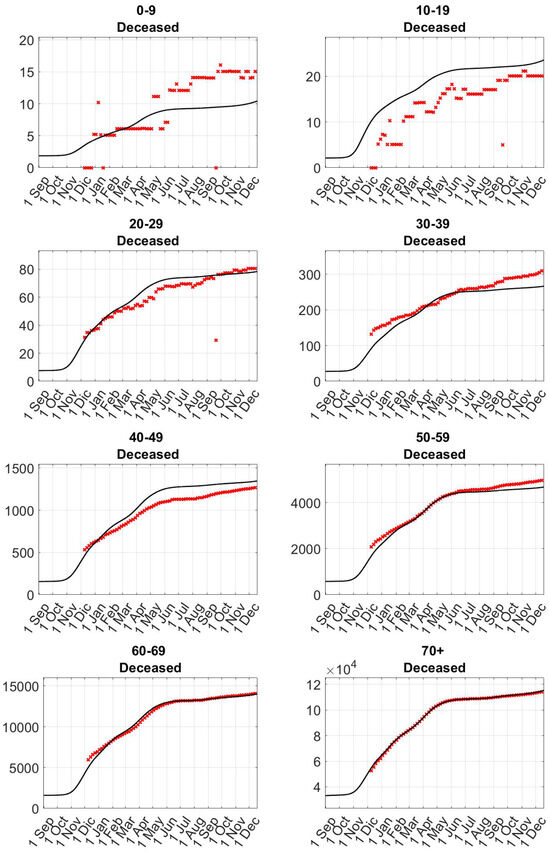 In Figure 22, we show the trend of positive individuals in the Green Pass case, and observe that it matches the available data. Since the gap between the curve and the data is smaller from July, we can deduce that a better monitoring policy was induced by the introduction of the Green Pass obligation (notice that the Green Pass could also be granted if swabs are negative). The curve also catches the rise in cases that began in mid-October. Figure 23 shows the distribution of reported and predicted Deceased individuals across age groups. As highlighted in Figure 10, the model’s calibration procedure results in a much better match for the elderly age groups, as it prioritizes deaths in those groups with the highest numbers, compared to the younger age groups.